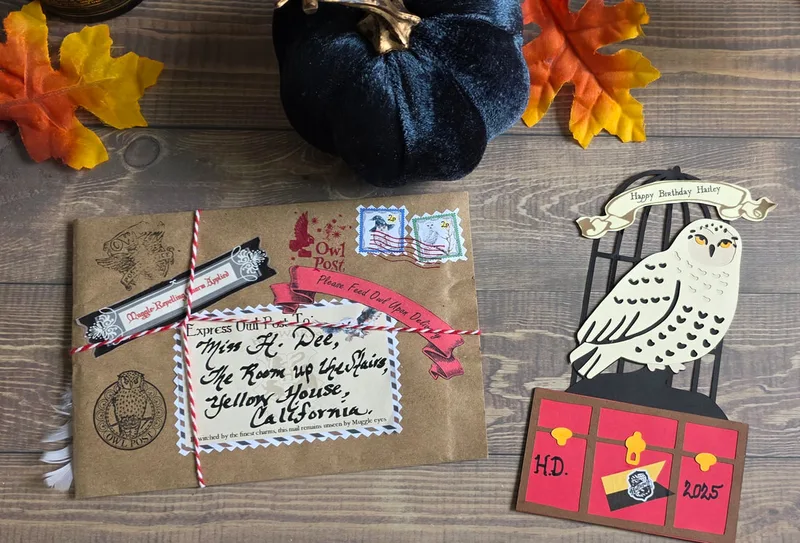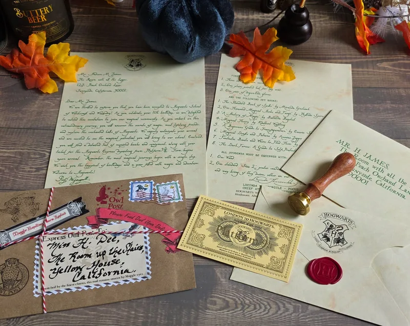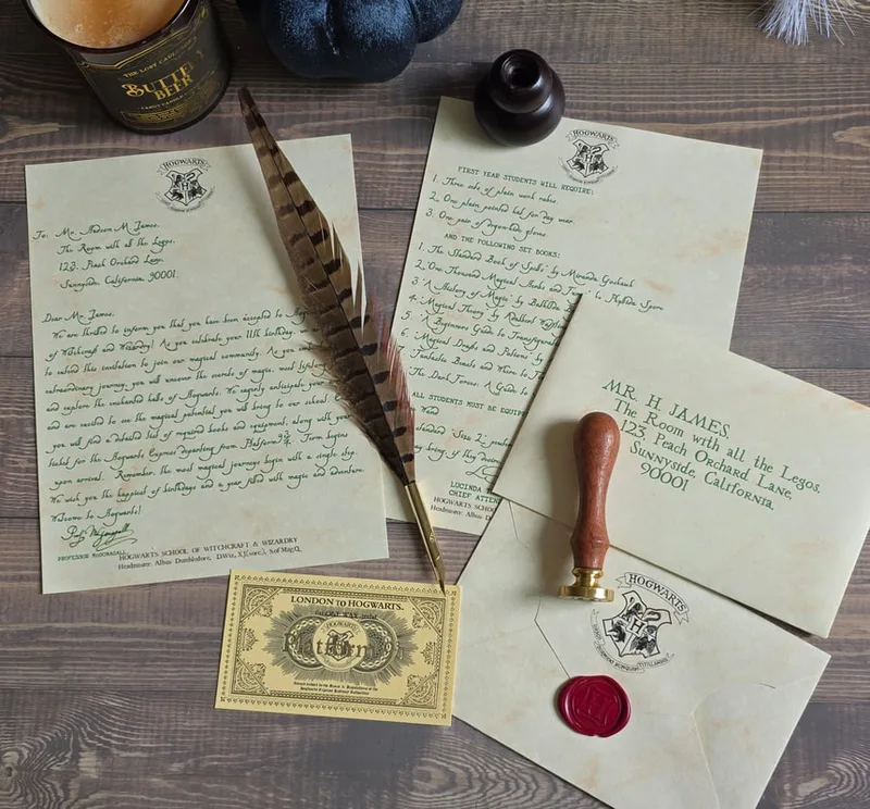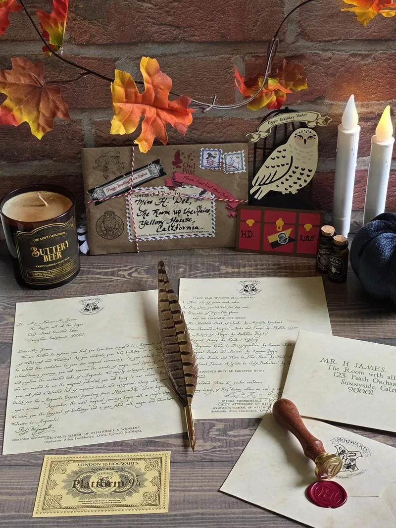 The same as the Classic letter, PLUS Owl Wrapping Treatment! My exclusive design — brown parcel wrap, string, wizarding stamps, magical calligraphy, and a wax seal (school crest or House if known). A true delight to open! PLEASE NOTE: The embellishments I use are inspired by the earlier days of the wizarding world, when ALL of the characters were still very much ALIVE and part of the magic. For that reason, some stickers and decorative details include them. If you’d prefer your wrapping to reflect a more current point in the story, I’m happy to substitute alternative stickers instead — simply leave a note at checkout. You will receive: Personalized Letter, First Year's Supply List, Ticket, Personalized Envelope and Owl Wrapping Treatment. Also includes the "Owl Wrapping Treatment" – brown paper, tied with string, and finished with a wax seal and white "Owl" feather. FREE USA SHIPPING! Details required: Title (Miss, Ms, Mrs, Master, Mr, Mx, Dr) First, Middle & Last Names Creative bedroom location (e.g., “The Room above the Stairs”) Full house address for letter and envelope (this is NOT the shipping address) For Owl Wrap only – Sorted? Which House?