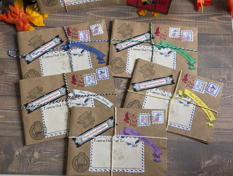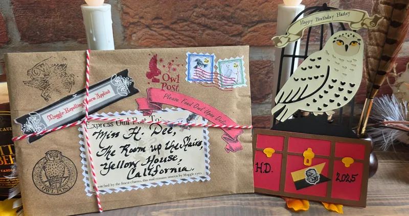 The same as the Classic letter, PLUS Owl Wrapping Treatment! My exclusive design — brown parcel wrap, string, wizarding stamps, magical calligraphy, and a wax seal (school crest or House if known). A true delight to open! PLEASE NOTE: The embellishments I use are inspired by the earlier days of the wizarding world, when ALL of the characters were still very much ALIVE and part of the magic. For that reason, some stickers and decorative details include them. If you’d prefer your wrapping to reflect a more current point in the story, I’m happy to substitute alternative stickers instead — simply leave a note at checkout. You will receive: Personalized Letter, First Year's Supply List, Ticket, Personalized Envelope and Owl Wrapping Treatment. Also includes the "Owl Wrapping Treatment" – brown paper, tied with string, and finished with a wax seal and white "Owl" feather. FREE USA SHIPPING! Details required: Title (Miss, Ms, Mrs, Master, Mr, Mx, Dr) First, Middle & Last Names Creative bedroom location (e.g., “The Room above the Stairs”) Full house address for letter and envelope (this is NOT the shipping address) For Owl Wrap only – Sorted? Which House?